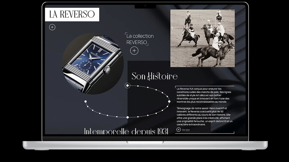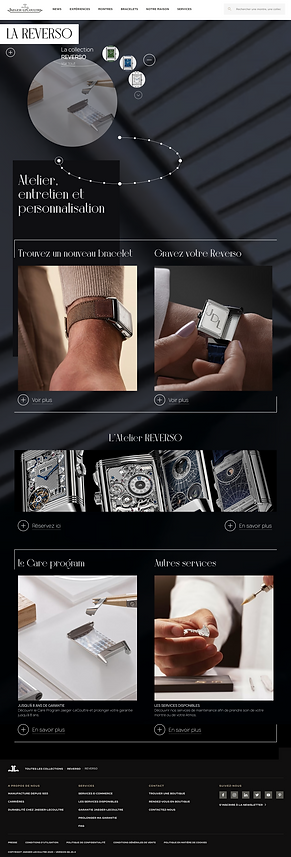 Tenant en compte les atoûts exceptionnels de la marque et suite à une visite et exposition des ateliers de Jaeger Lecoultre, leur modèle emblématique REVERSO m'a poussé à créer une video promotionnelle ainsi qu'un nouveau design d'interface pour la catégorie REVERSO de leur site.